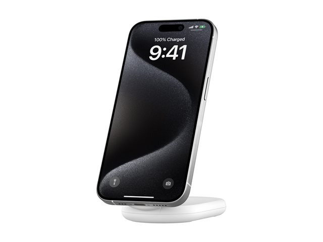 The Belkin BoostCharge wireless charging stand is designed for cellular phones, providing a seamless charging experience with a power output of 15 W. Featuring a USB-C to USB-C cable with a length of 1.55 m, this stand supports fast charging through Power Delivery 3.1 technology while also ensuring compatibility with MagSafe. Its magnetic alignment feature ensures proper positioning of devices for optimal charging.