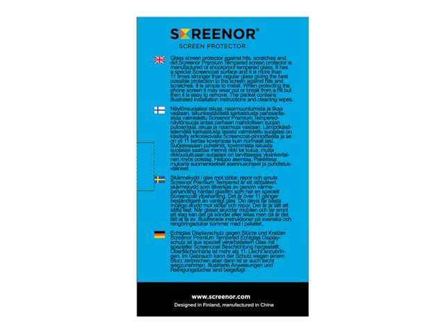 As the screen protector is manufactured of glass, when protecting the phone screen it may get broken from hardest hits but then it is easy to remove safely. The packet contains the screen protector, illustrated instructions for an easy successful installation, cleaning wipes and a positioning sticker. Screenor Premium Tempered screen protectors are manufactured from high-quality Japanese materials.