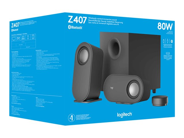 Få flott lyd på skrivebordet ditt med Z407 Bluetooth-høyttalere for datamaskiner. Det ekspertinnstilte 2.1-høyttaleranlegget har en toppeffekt på 80watt og en RMS på 40watt. Få oppslukende lyd med den nedoverrettede basshøyttaleren som gir "trøkk" i lyden, mens digital signalbehandling opprettholder klarhet gjennom hele lydspektret. Stilige ovale satellitthøyttalere som kan plasseres horisontalt eller vertikalt. Plasser dem slik det passer for deg. Kontroller det hele med den Bluetooth-aktiverte trådløse dreieknappen. Juster bass og volum, hopp over og pause spor uten å reise deg fra sofaen. Koble til med Bluetooth, USB-A eller 3,5 mm-innganger.