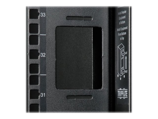 Two of the adjustable vertical mounting rails support toolless button-mount 0U installation of up to four compatible PDUs and cable managers. This feature makes it easier to route cabling to rack equipment and reduces cord clutter.