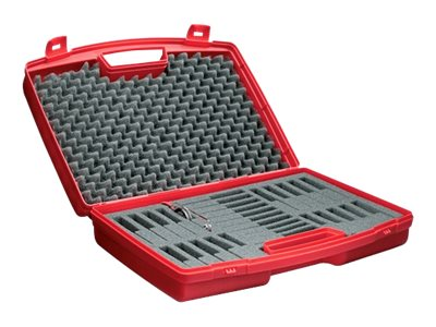 Dette kompassetuiet har plass til 30 Suunto A-10-kompasser, bruksanvisningen og et instruksjonskompass. Kompassetuiet er laget av rød plast.