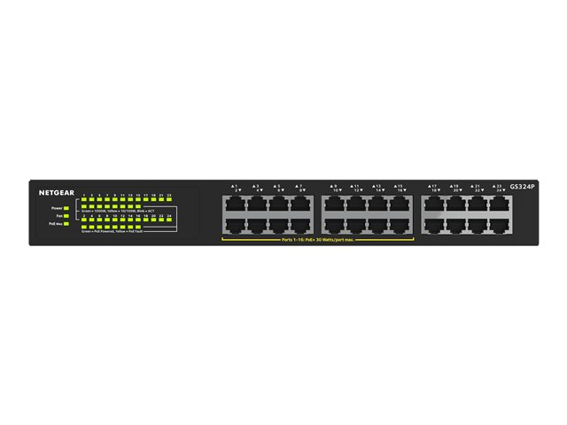 NETGEAR GS324P - Switch - ikke-styrt - 16 x 10/100/1000 (PoE+) + 8 x 10/100/1000 - rackmonterbar, stasjonær - PoE+ (190 W) GS324P-100EUS