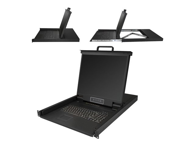 This KVM console provides complete keyboard, monitor and mouse control for eight computers. The console installs into 1U of rack space, offering a space-efficient solution for complete console control.