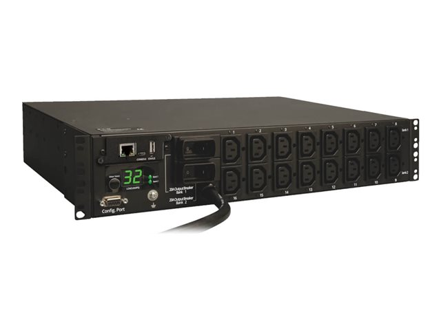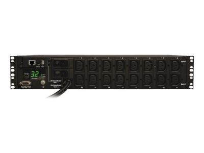 Tripp Lite Switched PDU / Power Distribution Unit offers advanced network control and monitoring with the ability to turn on, turn off, recycle or lock-out power to each individual receptacle, monitor site electrical conditions and remotely monitor output power consumption. Built-in LX Platform network management interface. The Java-free LX Platform HTML5-based network interface enables full remote access for PDU status monitoring and email notifications via secure web browser, SNMP, telnet or SSH. It supports 10/100 Mbps auto-sensing for optimum communication with an Ethernet network. Optional EnviroSense2 modules (sold separately) provide a variety of environmental monitoring capabilities. Protocols supported include HTTP, HTTPS, SMTP, SNMPv1, SNMPv2, SNMPv3, telnet, SSH, FTP, DHCP and NTP. Individually switched outlets can be controlled in real-time to remotely reboot unresponsive network hardware, or be custom programmed for user-defined power-up and power-down sequences to ensure proper startup of interdependent IT systems and prevent inrush-related overloads as network equipment is first energized. Unused PDU outlets can be electronically locked off to prevent the connection of unauthorized hardware. PDU output current consumption in amps is displayed locally via front panel current meter or remotely via web/network interface to warn of potential overloads before critical IT mains or branch breakers trip.
